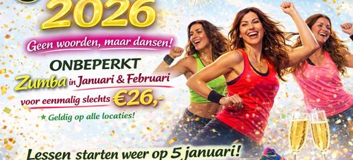 Begin het nieuwe jaar 2026 niet slechts met goede voornemens om aan je gezondheid te werken, maar voeg meteen de daad bij het woord en kom de eerste twee maanden van 2026 onbeperkt Zumba lessen volgen op alle beschikbare tijden en locaties van EliWorx voor slechts eenmalig (dus niet per maand!) 26 euro!